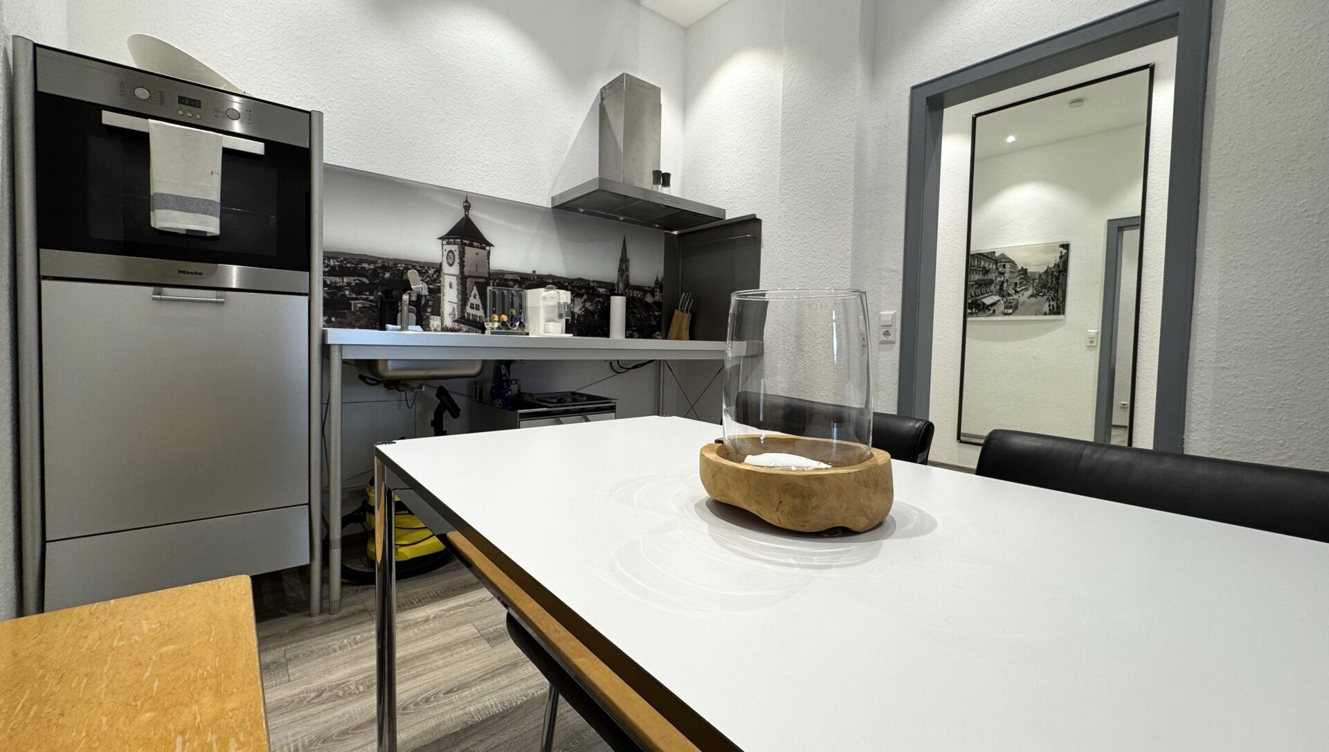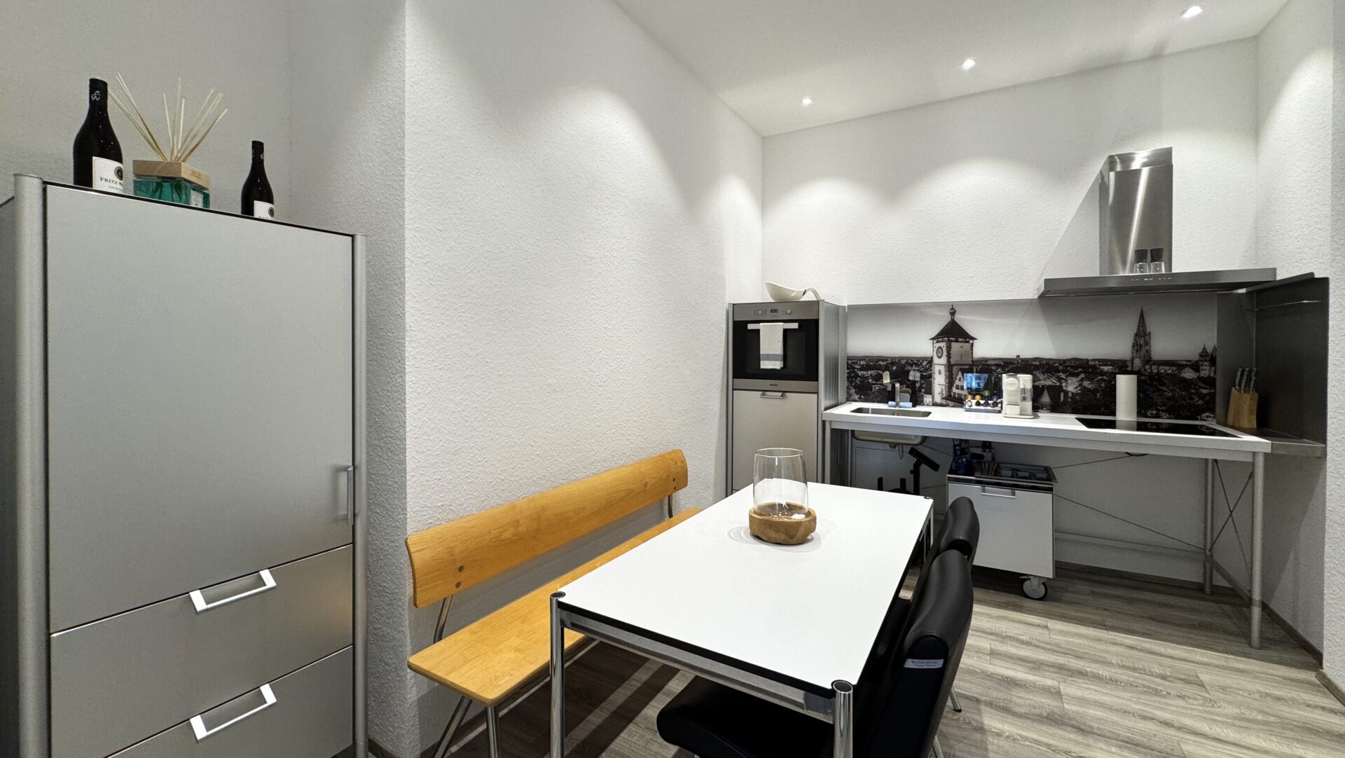 Genießen Sie die Annehmlichkeiten einer voll ausgestatteten Bulthaup-Designküche mit einem Esstisch für vier Personen, die zum Verweilen und gemeinsamen Mahlzeiten einlädt.